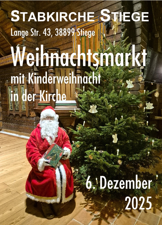 Sind die Lichter angezündet - heißt es wieder am 6. Dezember 2025. Das Außengelände verwandelt sich in einen kleinen aber feinen Weihnachtsmarkt mit liebevoll dekorierten Marktständen, die zum Schlemmen einladen. Stimmungsvolle Beleuchtung rundet die gemütliche Atmosphäre ab und den Weihnachtsbaum für zuhause kann man auch gleich kaufen. Eine Andacht 14.30 Uhr läutet den Tag ein, mit dem beliebten Weihnachtsliedersingen zum Harmonium geht es weiter. Eine Zusage haben wir bereits: Der Weihnachtsmann hat sich diesen Termin extra für uns freigehalten und kommt persönlich mit Wagen oder Schlitten - je nach Wetterlage - vorbei, um die Kinder zu beschenken. Zuvor feiern wir die Kinderweihnacht in der Kirche. Was sich im vergangenen Jahr aufgrund des schlechten Wetters spontan entwickelt hat, möchten wir gern zu einer Tradition machen. Ab 16.30 Uhr gehört die Kirche den Kindern. Unter Anleitung von Joana Weidner darf wieder getanzt und gesungen werden, bis der Weihnachtsmann gegen 17.00 Uhr erwartet wird. Die Geschenke, die der Weihnachtsmann bringt, geben die Eltern/Großeltern bitte wieder vorher bei Karola Gatzemann, Lange Str. 37 in Stiege ab. Bitte den vollständigen Namen des Kindes nicht vergessen. Wir bitten um Abgabe der Geschenke am 4. oder 5. 12., zwischen 15.00 und 20.00 Uhr. Für alle Kurzentschlossenen, Auswärtigen und Urlauberkinder ist die Abgabe des Geschenkes auch noch am 6.12. in der Kirche möglich.