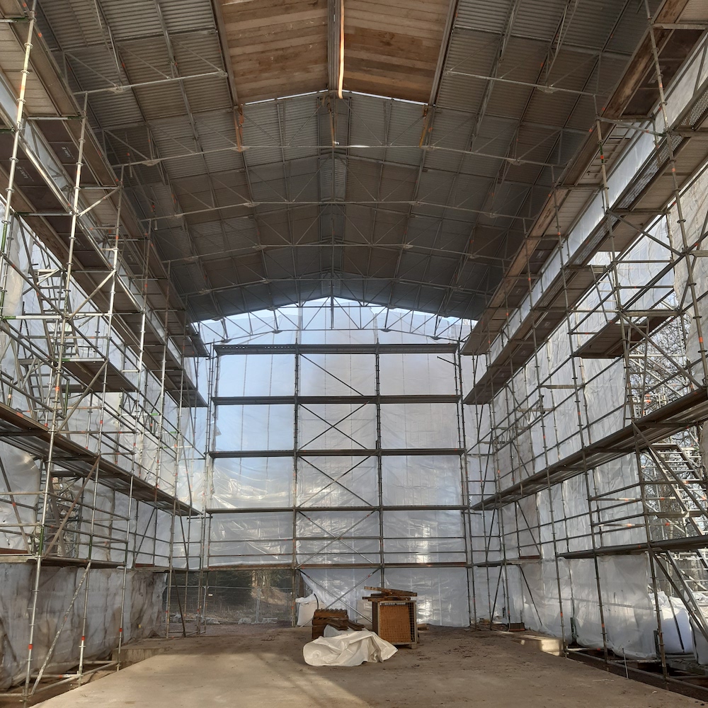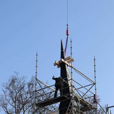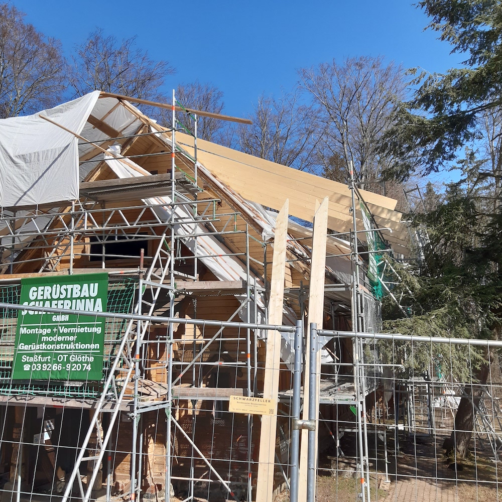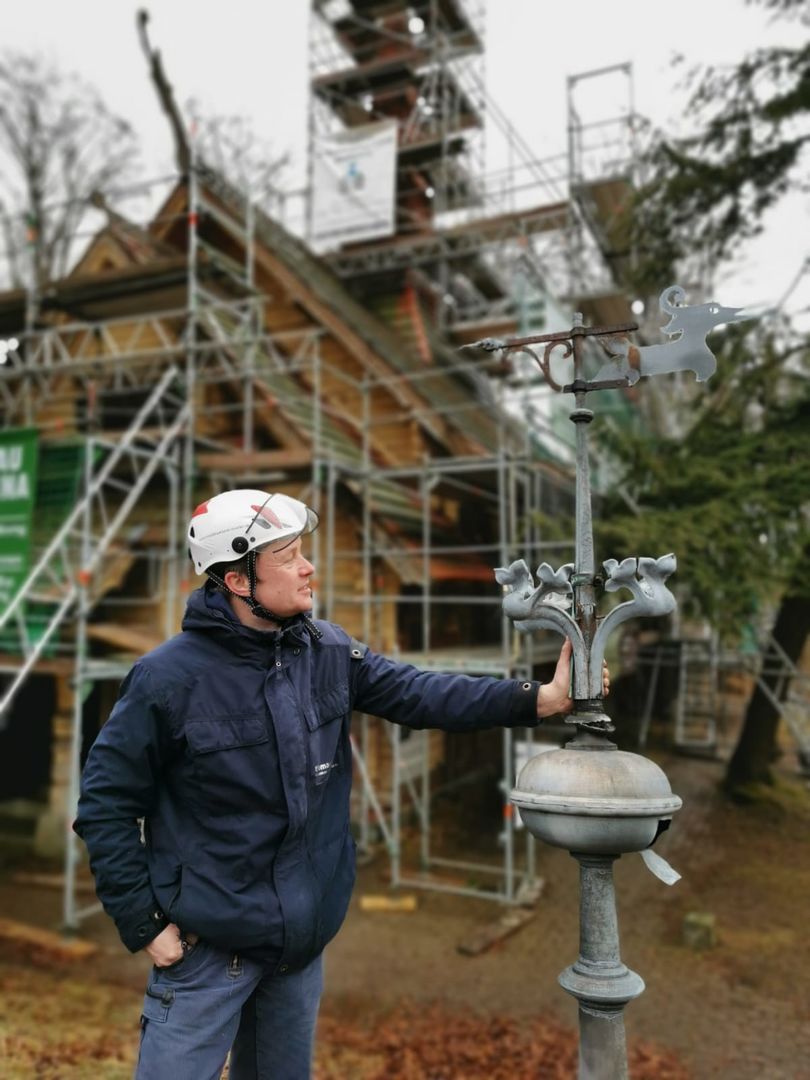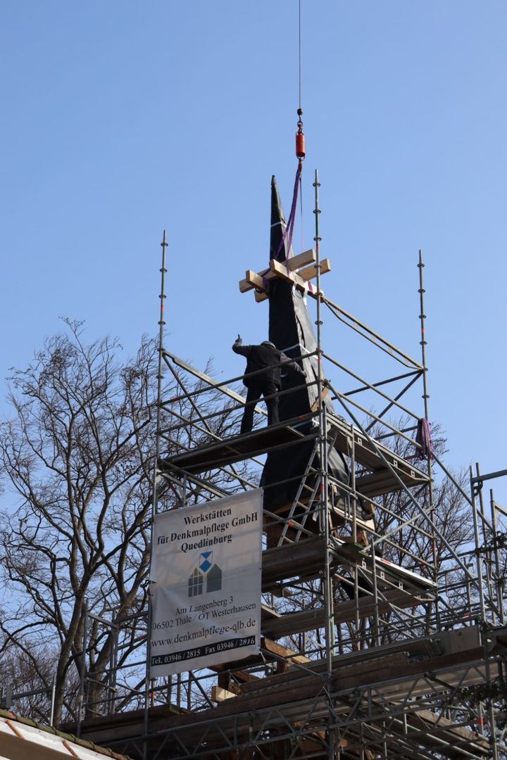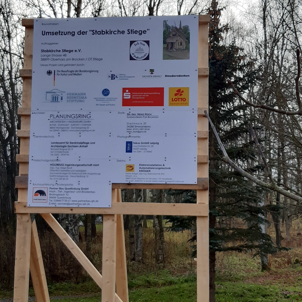 In diesem Jahr am ersten März startete dann das Projekt für den zweiten Bauabschnitt. Die Gerüstbauarbeiten der Firma Schaffrina begannen und es entstand ein riesiges Bauzelt am neuen Standort, welches zukünftig die Stabkirche beim Wiederaufbau vor der Witterung schützen soll. Daraufhin folgte am 11. März 2021 der offizielle Start der Umsetzung der kleinen Kirche. Unter bestimmten Coronabedingungen war es hier sogar möglich, von einer Vielzahl an Teilnehmern Unterstützung zu erhalten. Neben mehreren Pressevertretern und Mitgliedern war auch Staatssekretär für Kultur des Landes Sachsen-Anhalt, Dr. Gunnar Schellenberger, vor Ort. So konnte gemeinsam die Turmzierde abgenommen und ein kleiner Gästeempfang gestaltet werden.
