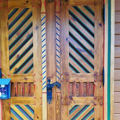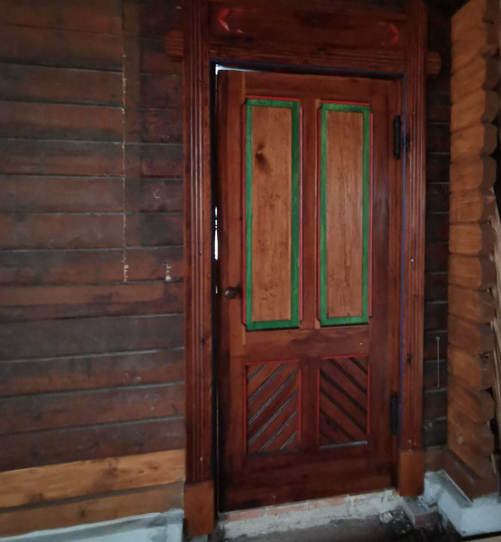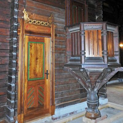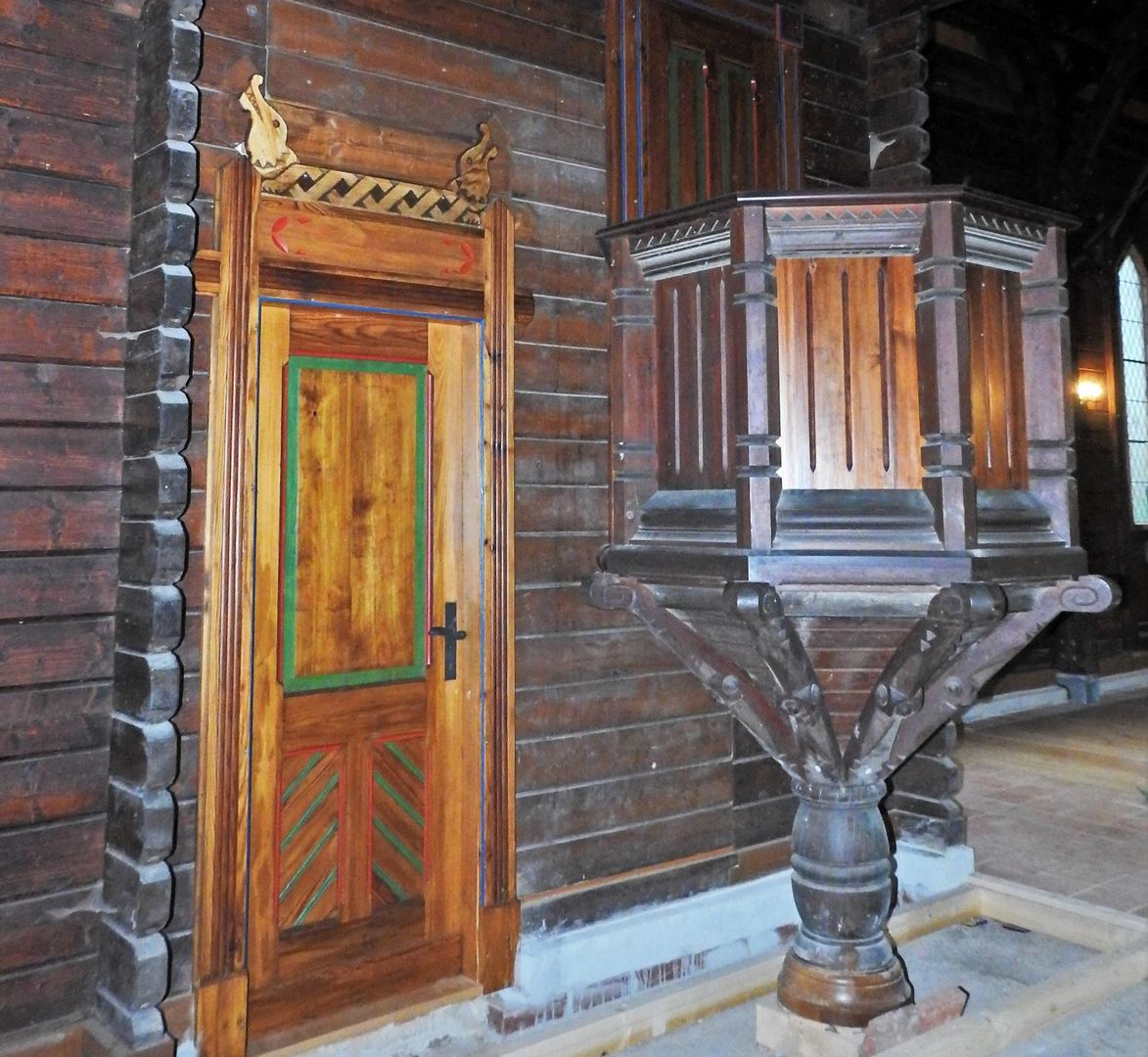 Auch im Innenraum ist einiges passiert. Entsprechend der ursprünglichen Fußbodengestaltung wurde unter den Sitzreihen eine hochwertige Dielung verlegt, alle anderen Bereiche wurden mit manufakturgefertigten Steinplatten ausgelegt. Sobald die Dielung befestigt werden kann, werden auch das Gestühl und der Altar wieder eingeräumt. Bei der Restaurierung der Türen kam die ursprüngliche Fassung zum Vorschein. Beim letzten Anstrich hat man die Türen einheitlich braun gestrichen, tatsächlich hatten sie farbliche Absetzungen. Diese sind jetzt wieder sichtbar. Ein kompletter neuer Innenanstrich konnte aus Kostengründen noch nicht realisiert werden.