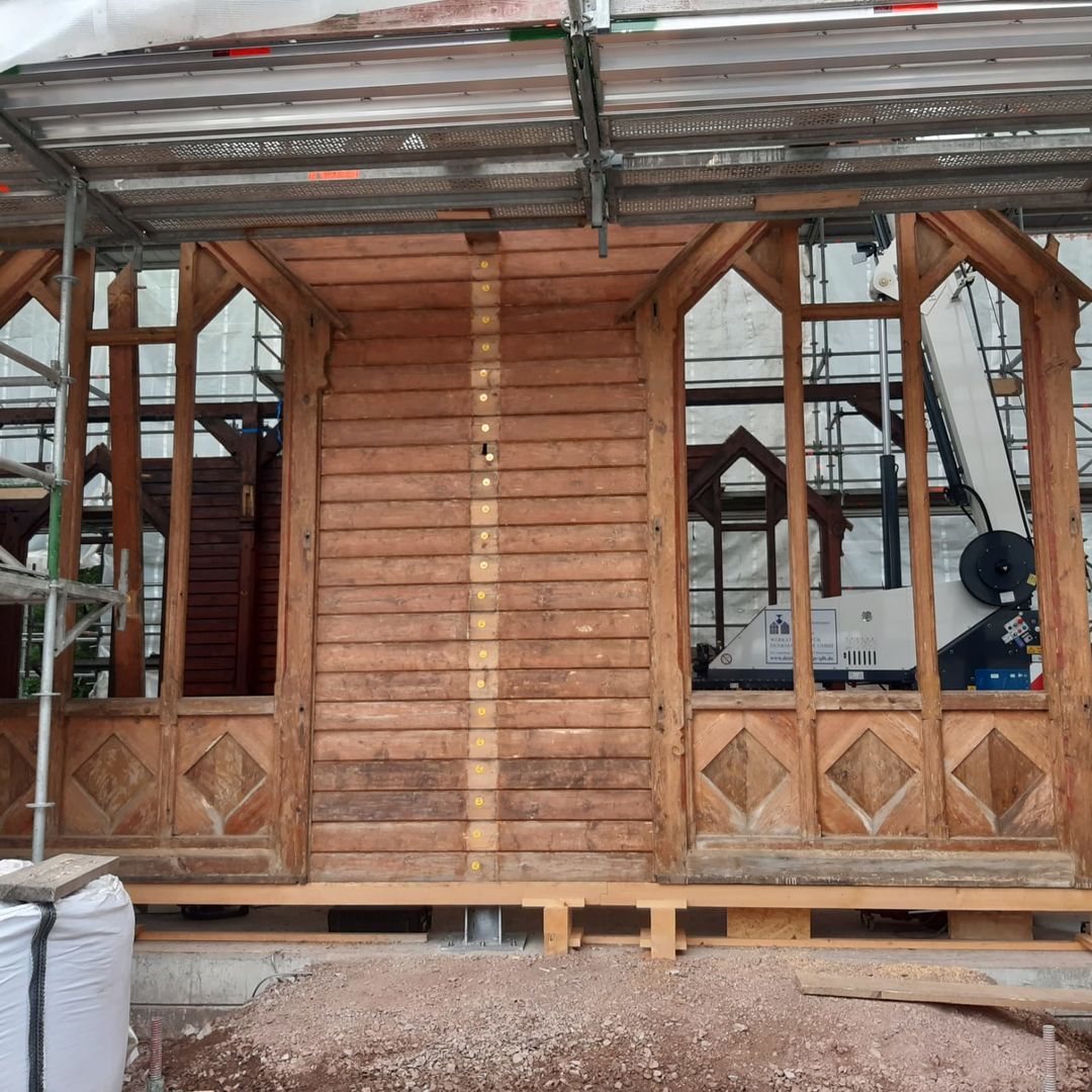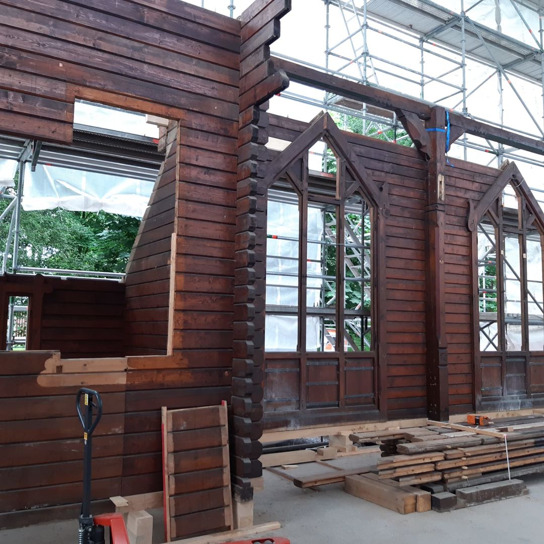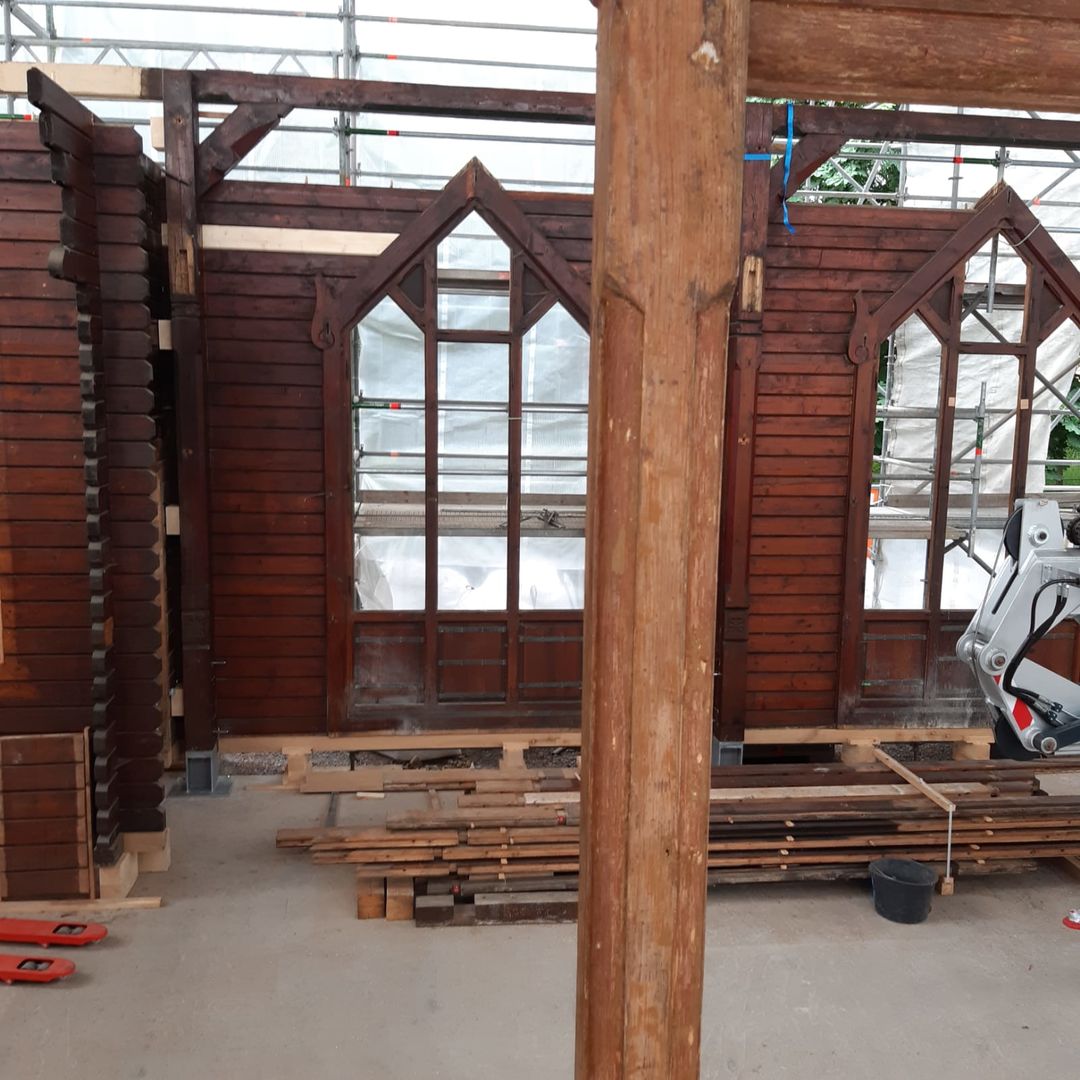 Lange wurde über Bauplänen gebrütet, die Bleiglasfenster werden in der Glasmanufaktur wieder rekonstruiert und die Elemente der Kirche wie ein Puzzle an ihrem neuen Zuhause auf der Bodenplatte zusammengesetzt. Und auch wenn es noch viel zu tun gibt, der Löwenanteil der Arbeiten ist beendet. Das Abbauen und Versetzen war die risikoreichste Aufgabe des Projektes und wo diese nun hinter der Stabkirche liegt, können alle erleichtert durchatmen und sich auf die Rekonstruktion fokussieren.