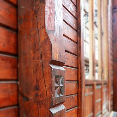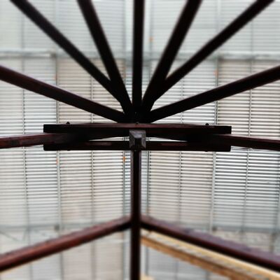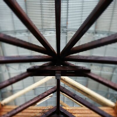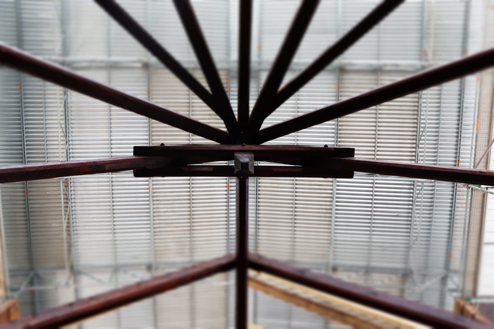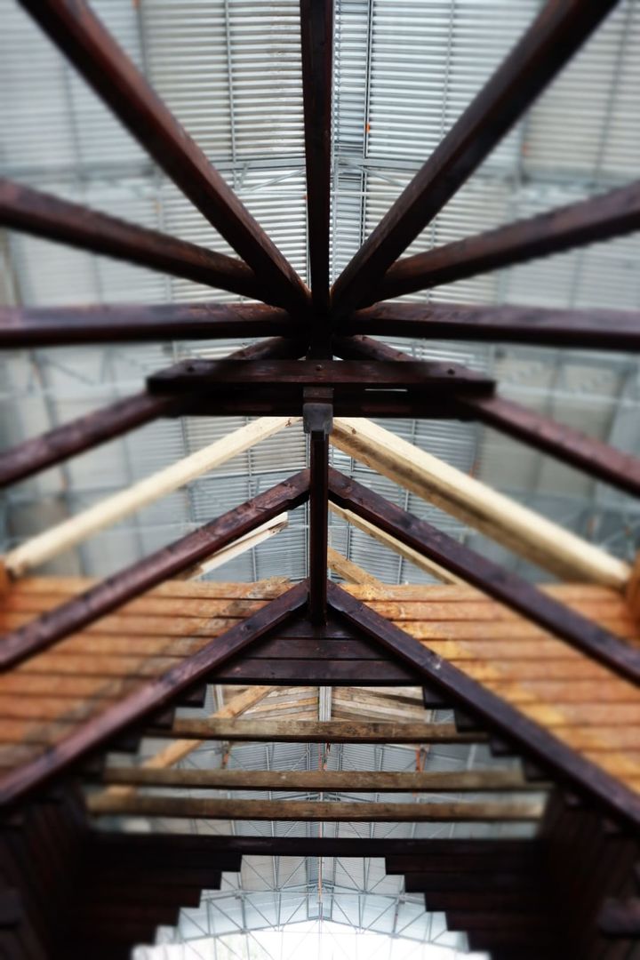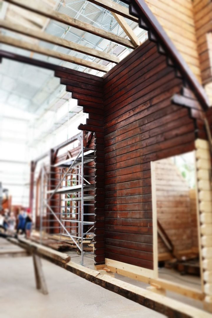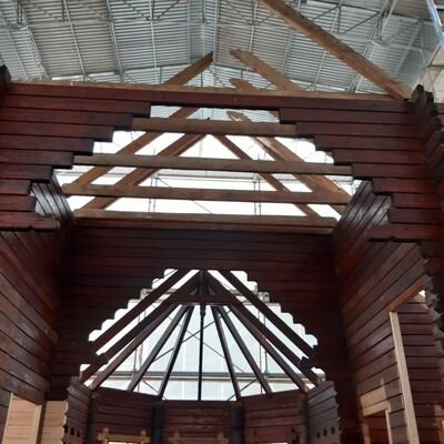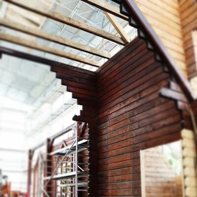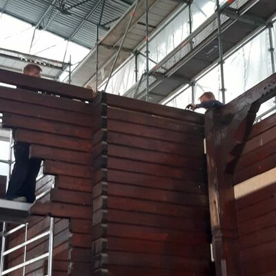 So sieht die Stabkirche Stiege zumindest im Augenblick aus. Umgeben von Gerüsten und Planen, gestützt durch Halterungen und Gegengewichte stehen die einzelnen Elemente und Bauteile der Kirche nun frei bereits auf der neuen Bodenplatte. Um sie von allen Seiten restaurieren und bearbeiten zu können, stützen und sichern im Moment noch Gerüstleitern die Arbeiten. Aber langsam lichtet sich das geordnete und gut durchdachte Chaos. Stück für Stück schritten die Arbeiten in den letzten Wochen mit einem beständigen Tempo voran.