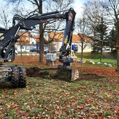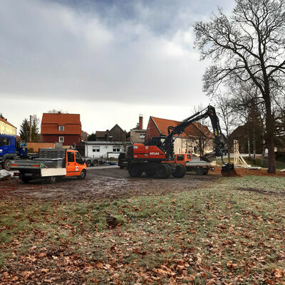 Bei 3 Grad Celsius mit anfänglichem Nebel kam die Sonne letztendlich doch noch heraus und so gab es beste Bedingungen für den Baustart. Nach und nach fuhren Versorgungscontainer, LKW und natürlich der Bagger vor und um 9:10 Uhr zog der Bagger zum ersten Mal die Schaufel über das Gelände.