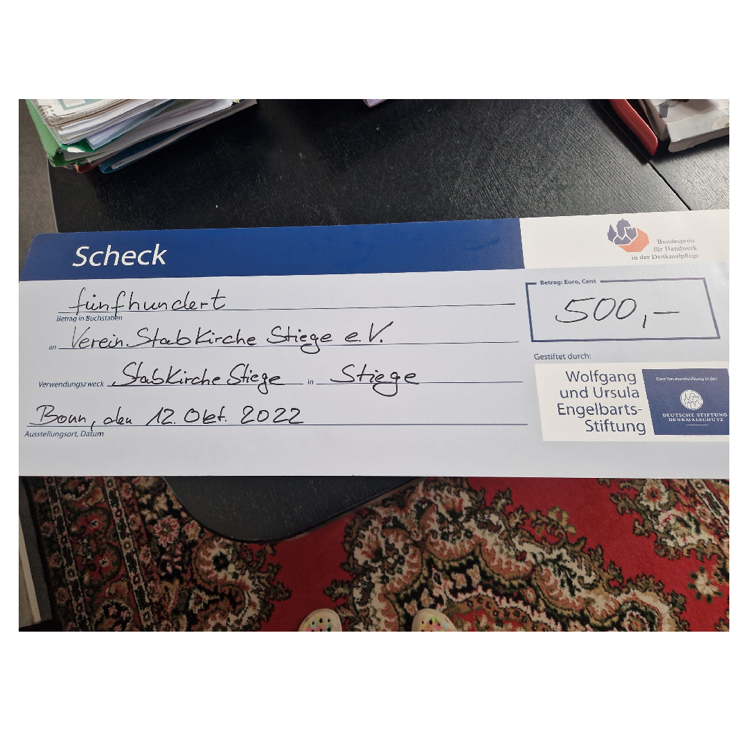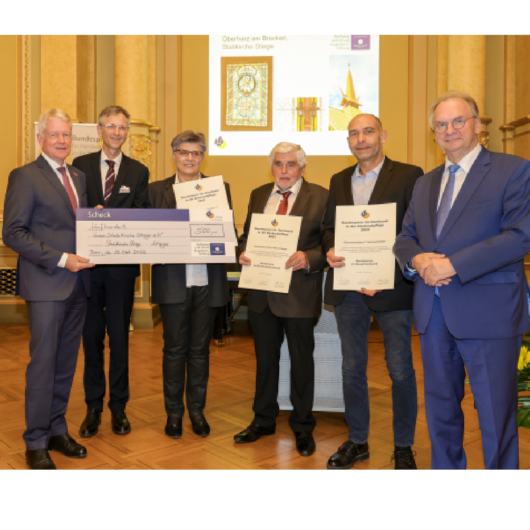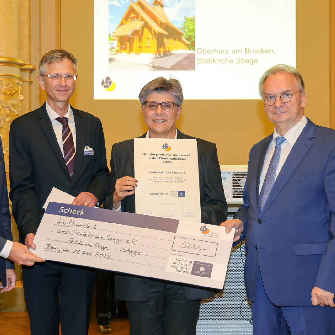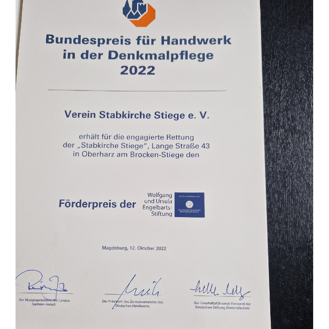 Der "Bundespreis für Handwerk in der Denkmalpflege wird jährlich in zwei Bundesländern verliehen. 2022 wurde er in Mecklenburg-Vorpommern und Sachsen-Anhalt ausgelobt. Auch wir haben uns beworben und sind in die Vorauswahl gekommen. Im Juli hat uns eine Kommission aus verschiedenen Fachleuten besucht, um sich vor Ort ein Bild von unserem Denkmal "Stabkirche Stiege" zu machen. Am 12.10.22 fand die Preisverleihung in Magdeburg statt. Wir haben den mit 500 € dotierten Förderpreis der Wolfgang und Ursula Engelbarts-Stiftung "...für die engagierte Rettung der "Stabkirche Stiege..." erhalten. Wir freuen uns und bedanken uns für diese überregionale Anerkennung der Arbeit des Vereins "Stabkirche Stiege e.V."