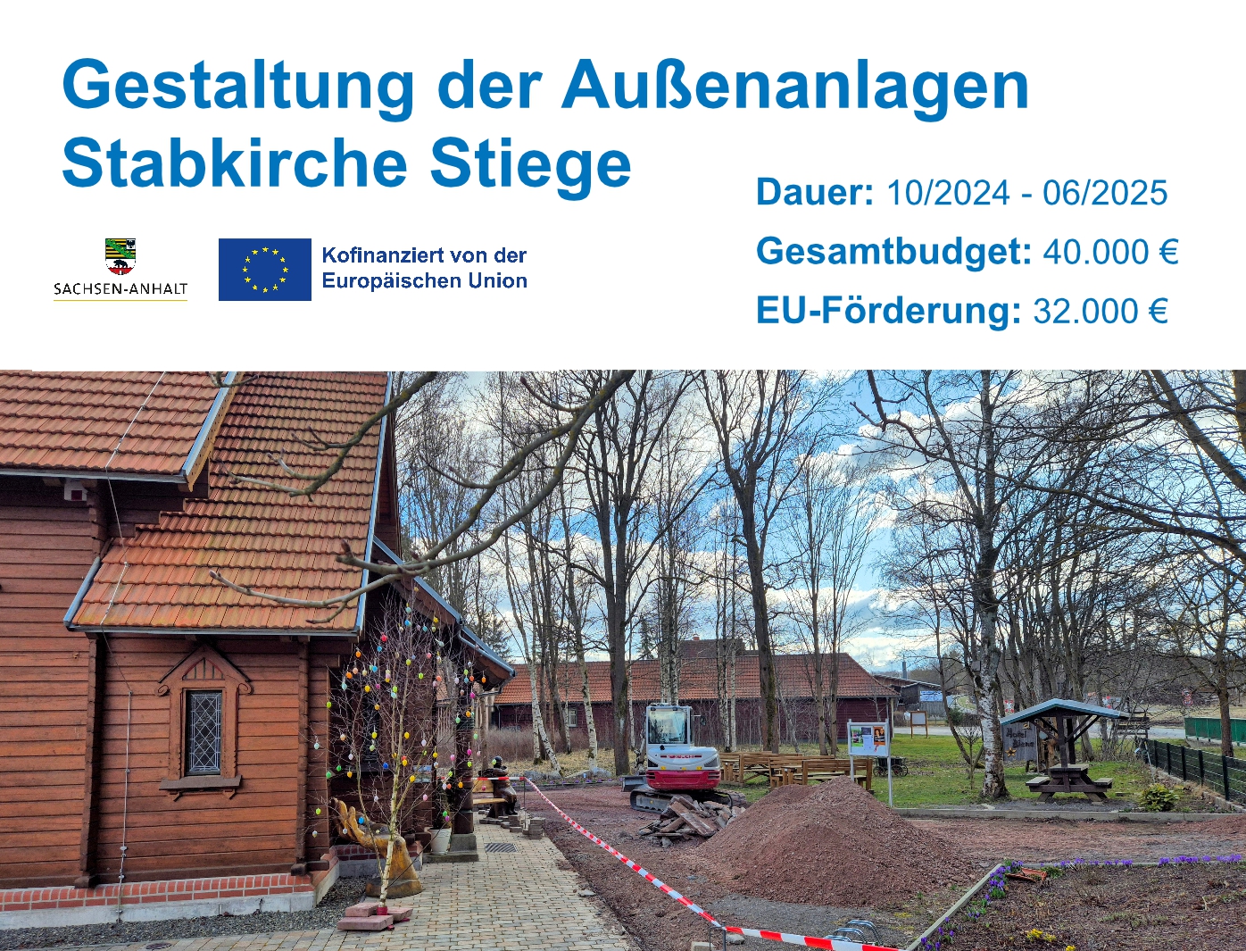 Mit Hilfe einer Förderung über LEADER/CLLD konnten wir die Gestaltung der Außenanlagen fortsetzen. So wurden der Bereich neben der Kirche und die Einfahrt an die vorhandene Pflasterung angepasst und vervollständigt. Besonders für gehbehinderte Besucher der Stabkirche Stiege wird diese Maßnahme eine große Erleichterung bringen. In diesem Zuge wurde auch das Problem der Ableitung des Regenwassers beseitigt. Des weiteren wurde eine elektrische Anlage für die Ausgestaltung von Außenevents hergestellt: