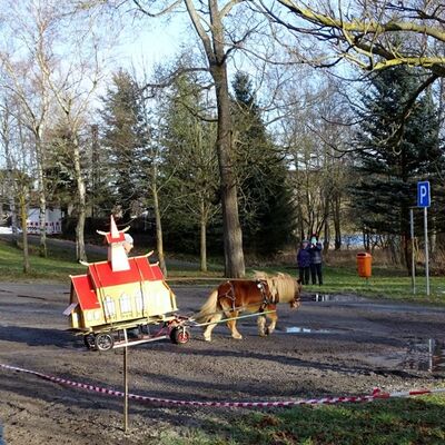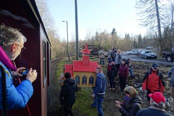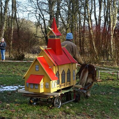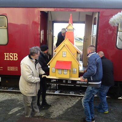 Wie dieser Umzug funktionieren kann, zeigten die Vereinsmitglieder rund um den Vorsitzenden Helmut Hoppe mithilfe der kleinen Modellkirche. Sie wurde am Albrechtshaus von Besuchern aus Halle, Berlin und der Harzregion aufgenommen und zum Gepäckwagen der wartenden Harzer Schmalspurbahn gebracht. Gemeinsam mit zahlreichen Gästen ging es dann nach Stiege, wo unser Mitglied Hans Powalla bereits mit seinem Pony Felix wartete und die Kirche mit 1 PS flott zum neuen Standort brachte.