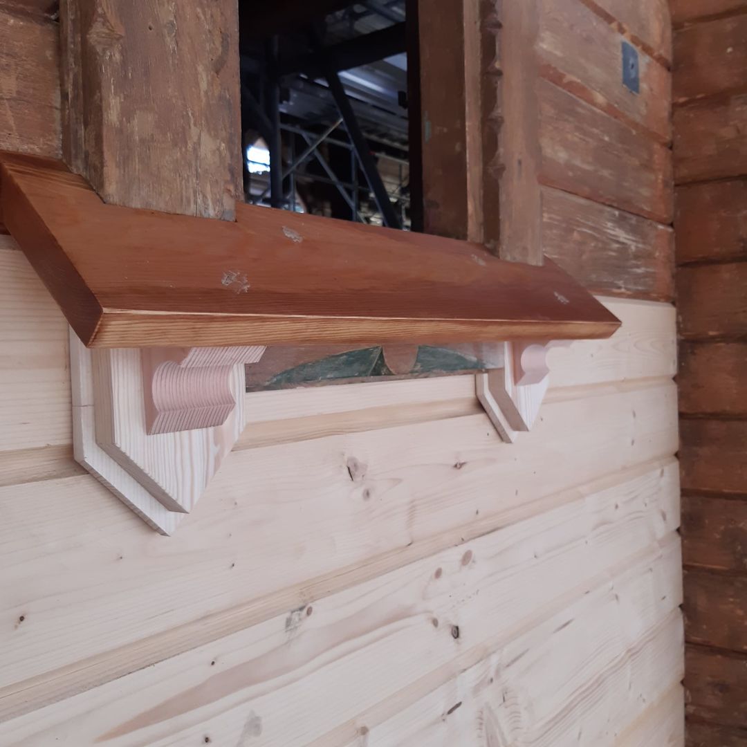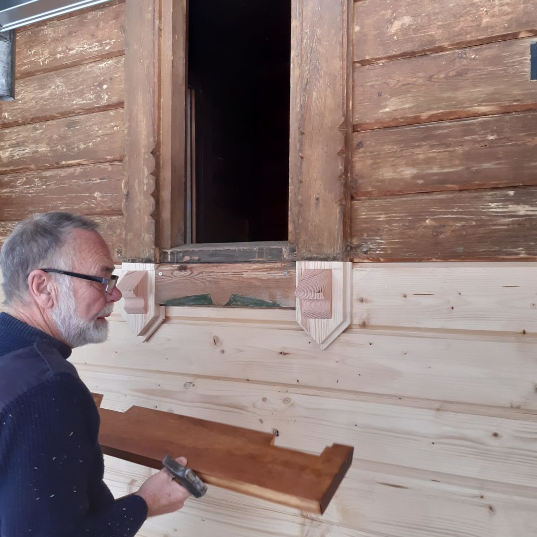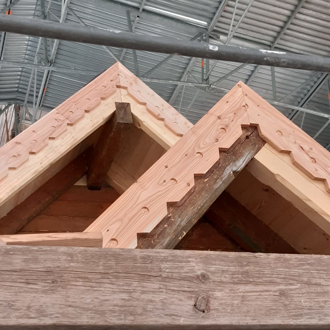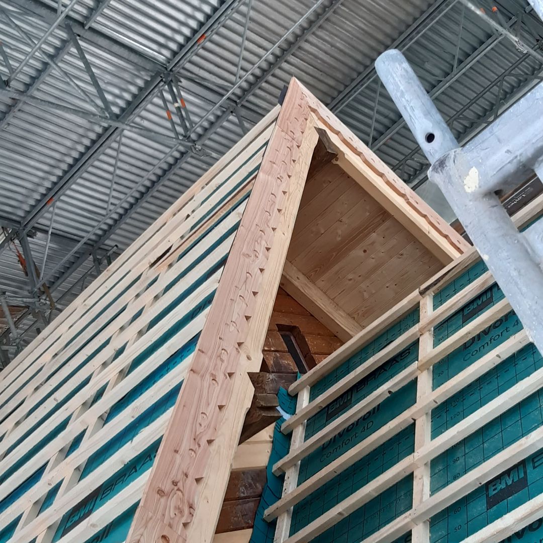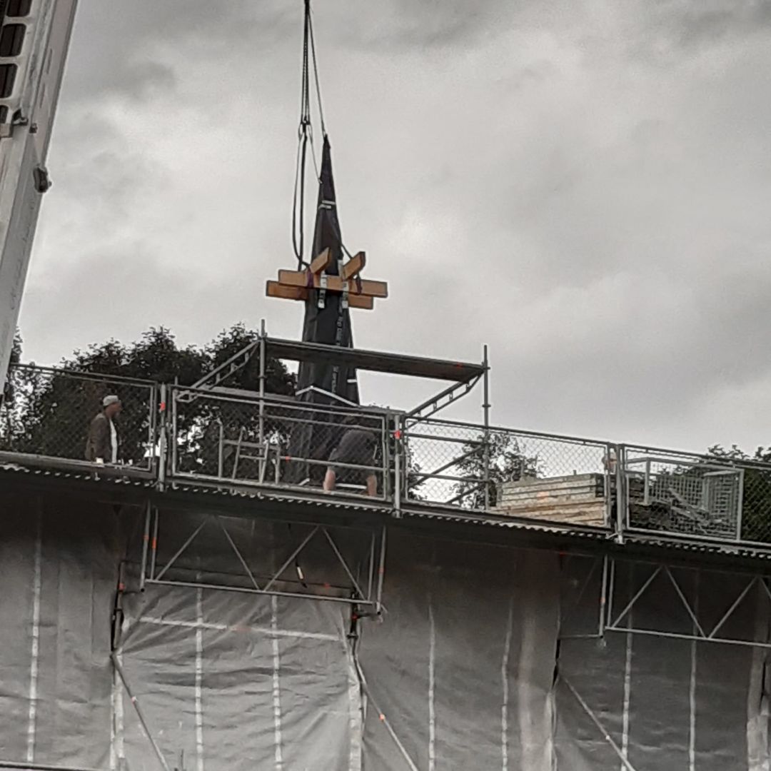 Aber auch die weitere Restauration der Stabkirche an ihrem neuen Standort zeigt große Fortschritte. Besonders zu verzeichnen ist die Umsetzung des unteren Kirchturmteils an dessen alte Position und auch die Glocke konnte diesem guten Beispiel bereits folgen. Zusätzlich geht es auch mit dem Dach der Stabkirche voran. Bei der letzten Besichtigung auf der offenen Baustelle konnte dort bereits eine Dacheindeckung mit ersten Ziegeln bestaunt werden. Jetzt ist auch die Turmspitze bereits zu sehen und ragt aus dem Dach empor.